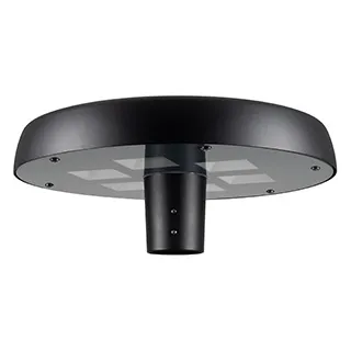 Венчающий светодиодный светильник. Мощность 50 Вт, св. поток 5680 лм, 112 лм/Вт, тёплый 3000 K, CRI>80, угол 140°, напряжение питания 230 В. Черный корпус из алюминия, экран закаленное стекло, степень защиты IP65. Размер: диаметр 510 мм, высота 200 мм. Монтаж на вертикальную опору диаметром 76 мкакой материал м.