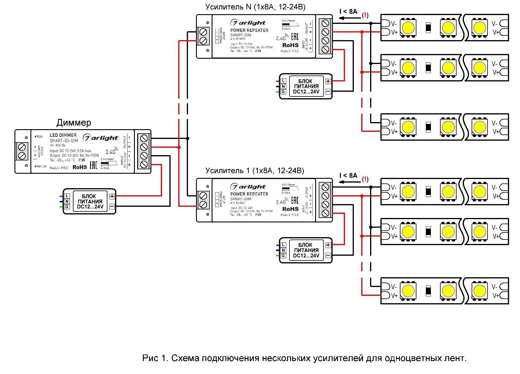 Важно! Напряжение блока питания и напряжение питания подключаемых к усилителю лент должно быть одинаковым. Мощность подключаемого к усилителю блока питания должна быть на 25% больше мощности, потребляемой лентами, подключенными к усилителю. К одному усилителю можно подключить только один блок питания.