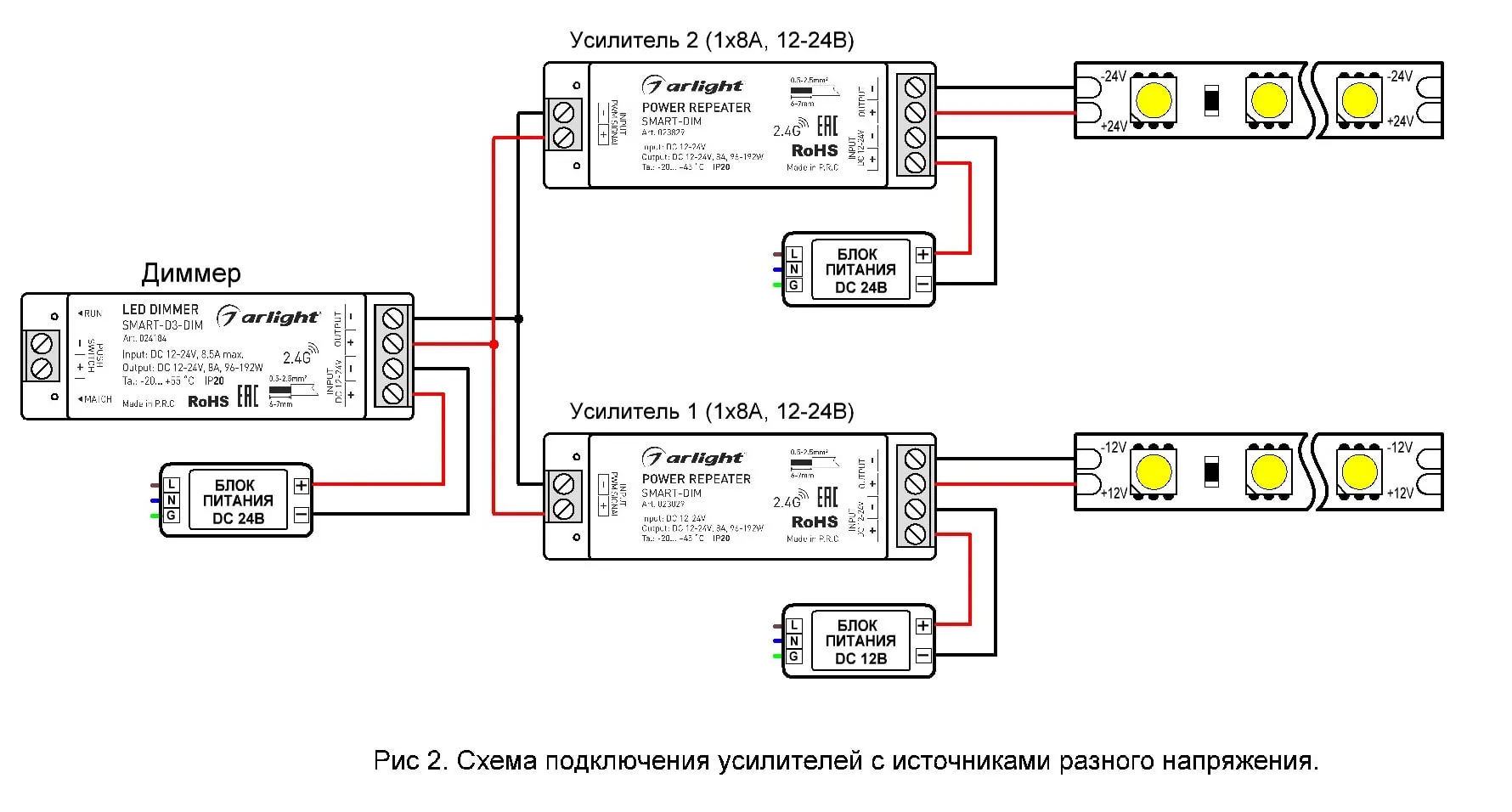 Стоит отметить, что напряжение питания усилителей и контроллера может быть разным. Например, усилитель может быть подключен к источнику напряжения и лентам 24 В, а контроллер — к источнику 12 В. Схема такого подключения показана на рис. 2.