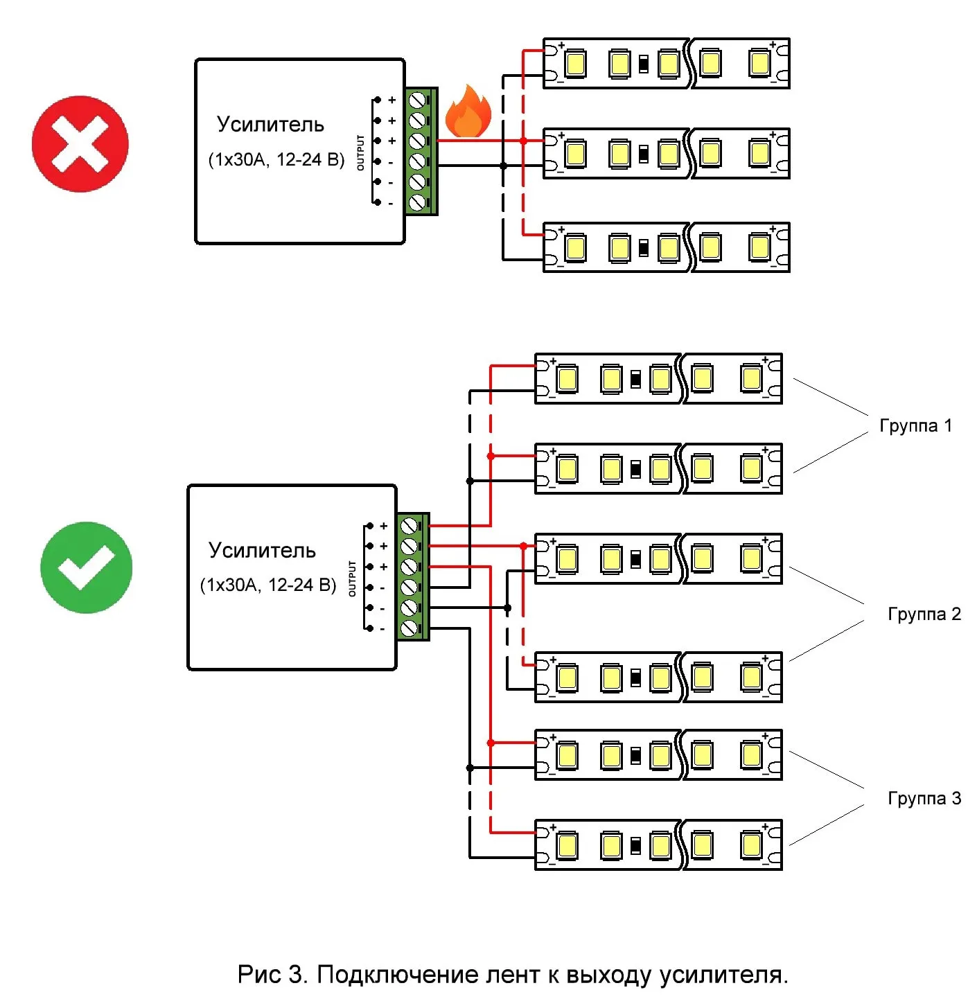 Для усилителей большой мощности необходимо обращать внимание на подключение лент к выходным клеммам усилителя. Так как пропускаемые токи таких усилителей могут достигать 30 А и более, то на выходе данных усилителей ставится несколько клемм для подключения лент. Попытка пропустить 30 А через одну клемму приведет к ее сильному разогреву, оплавлению и возможному разрушению усилителя. Примеры правильного и ошибочного подключений приведены на рис. 3. Наиболее оптимальным вариантом подключения является одинаковое распределение нагрузки между группами 1-2-3.