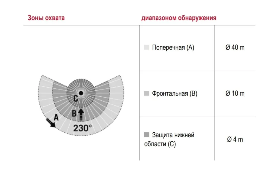 • Датчик движения с углом охвата 230° и дальностью действия Ø 40 м (по касательной)