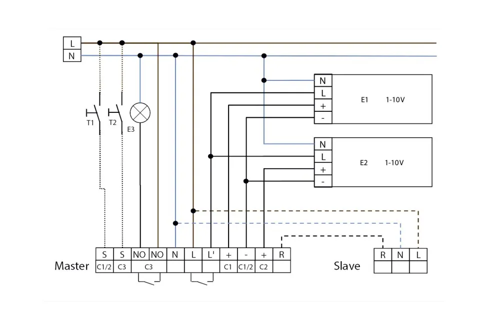 - Кнопка 1: входящий контакт 230 В для кнопки включения/выключения и диммирования света