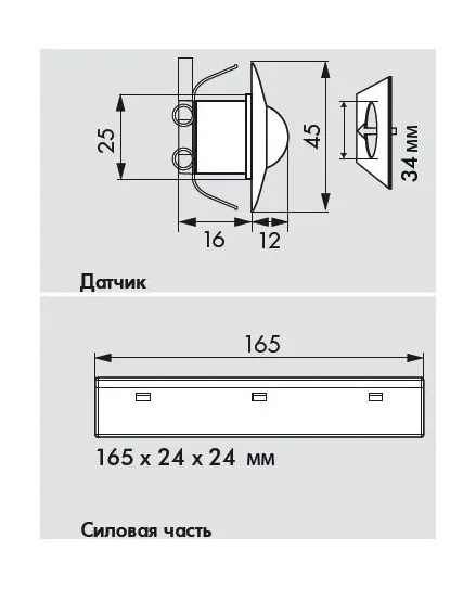 • Габариты Датчик: Ø 45 x H 28 мм. Силовая часть: Д 165 x Ш 24 x В 24 мм