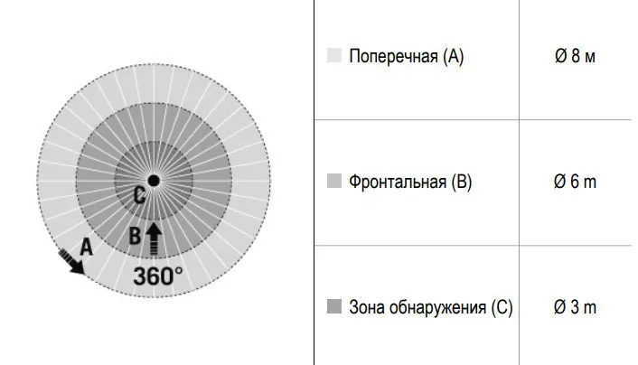 | диапазоном обнаружения Фронтально | Ø 6 м |