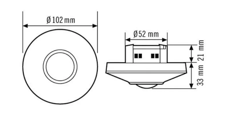 - Датчик присутствия для встраивания в потолок в монтажную коробку с зоной охвата 360°