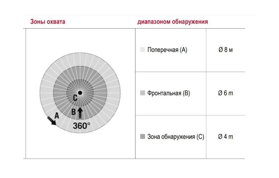 | Угол охвата, диапазон обнаружения | Ø 4 м |