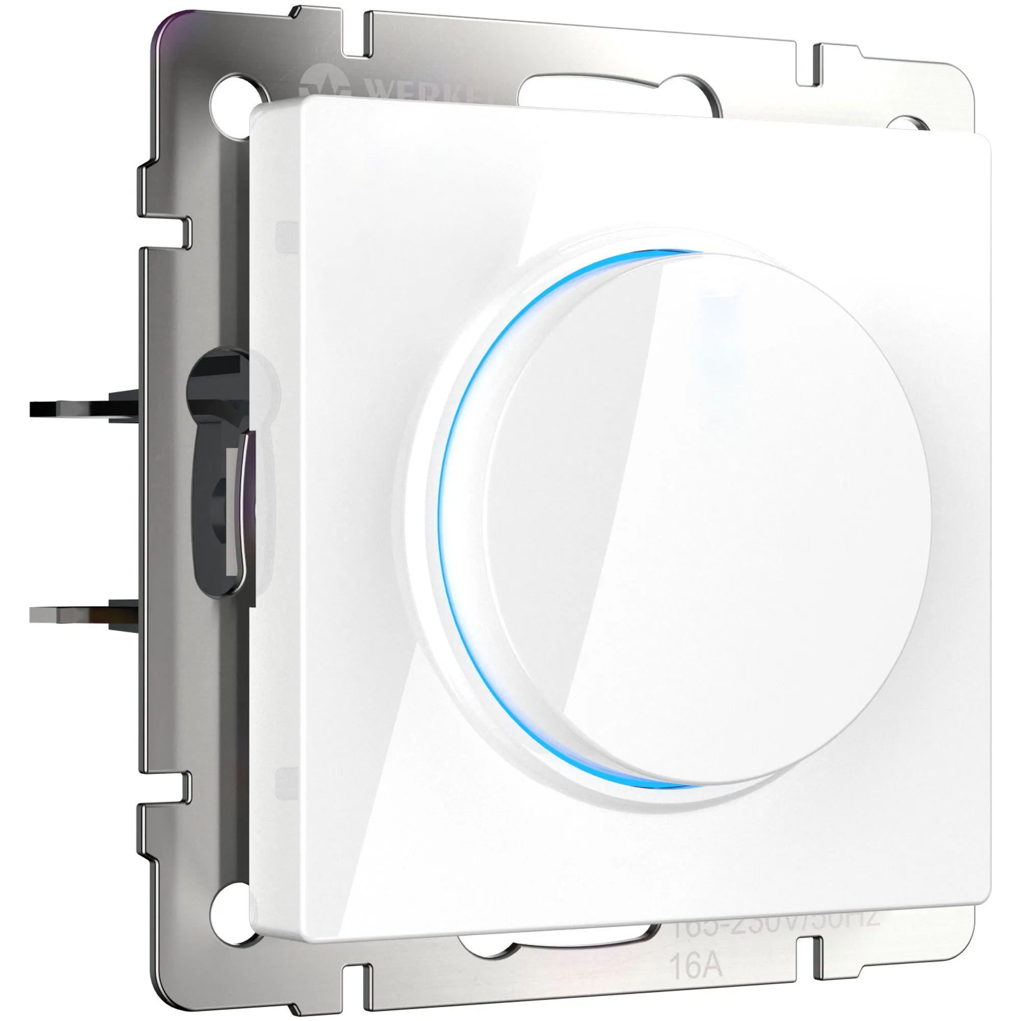 С помощью современного диммера с подсветкой Werkel легко изменять уровень освещенности в помещении. Включение и выключение производится нажатием на кнопку. Изменение режима яркости и интенсивности светового потока регулируется поворотной кнопкой. Диммер совместим с галогенными лампами и лампами накаливания. Он оснащен контурной LED-подсветкой синего цвета, интенсивность свечения которой зависит от режима работы. На максимальном уровне освещенности подсветка автоматически отключается, экономя электроэнергию. Диммер можно использовать в тандеме с проходным выключателем. Для надежной и бесперебойной работы диммера рекомендуется оставлять запас мощности ~15% (510 Вт), при максимальной мощности 600 Вт.