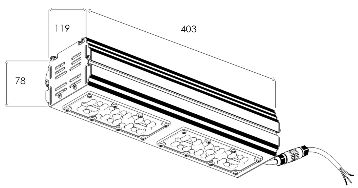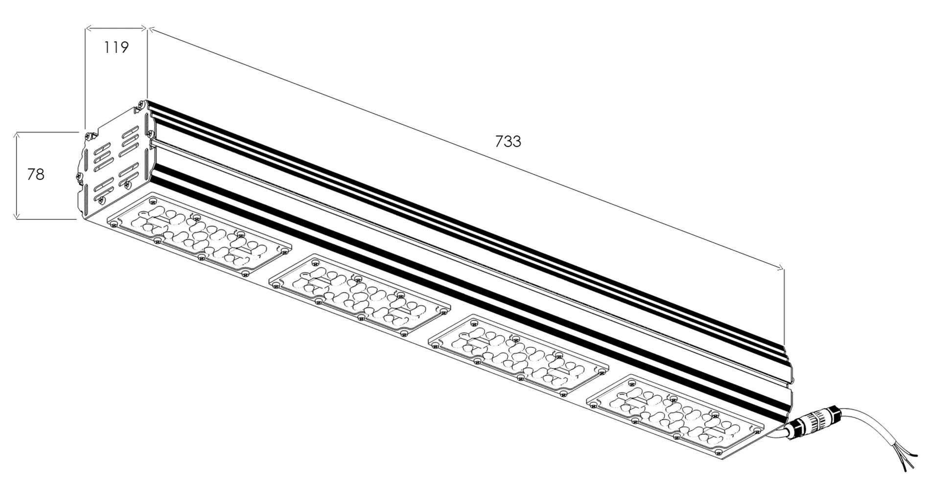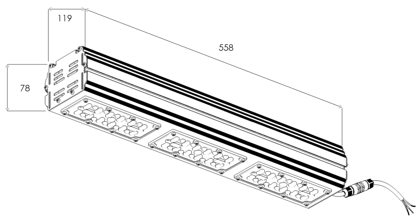 | USPS-3-01-100 | L558 B119 H78 | 100 W | 17110 lm | 14500 lm | 145 lm/w | 0,0051м³ | 3,8 | 36 |