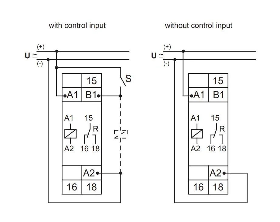 Реле времени - Задержка включения Задержка выключения с контактом управления ( R ) Напряжение питания U должно быть постоянно подано на реле времени (зеленый LED ВКЛ). При замыкании контакта управления S, выходное реле R замыкается (желтый LED ВКЛ). При размыкании контакта управления S начинается отсчет интервала времени t (зеленый LED мигает). По истечении интервала t (зеленый LED ВКЛ) выходное реле размыкается (желтый LED ВЫКЛ). При повторном замыкании контакта управления S до истечения интервала t цикл начнется сначала. Реле времени - Задержка выключения с контактом управления Формирование импульса при подаче напряжения питания ( Wu ) При подаче напряжения питания U выходное реле R замыкается (желтый LED ВКЛ) и начинается отсчет заданного интервала t (зеленый LED мигает). Реле времени - Формирование импульса при подаче напряжения питания Генератор импульсов начиная с паузы (циклическое реле) ( Bp ) При подаче напряжения питания U начинается отсчет заданного интервала t (зеленый LED мигает). По истечении интервала t, выходное реле R замыкается (желтый LED ВКЛ) и снова отсчитывается заданный интервал t, по истечении которого выходное реле R размыкается (желтый LED ВЫКЛ). Цикл повторяется с соотношнением импульс-пауза 1:1 пока не будет прервана подача напряжения питания. Реле времени - Генератор импульсов начиная с паузы (циклическое реле) Схема подключения E1ZMQ10 24-240VAC/DC Габаритный чертеж E1ZMQ10 24-240VAC/DC