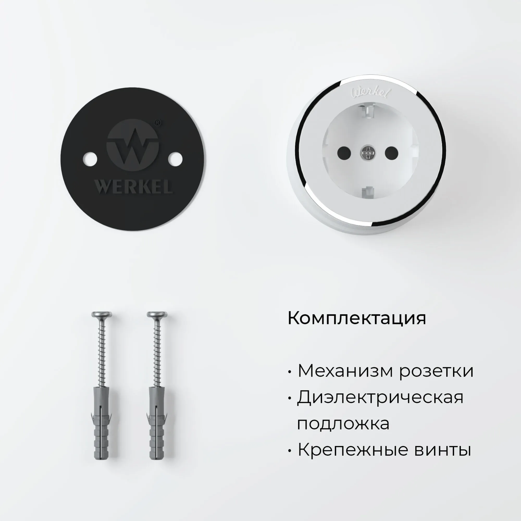 Дополнить образ помогут рамки Werkel из металла, стекла, и дерева, а так же аксессуары для накладного монтажа проводки.