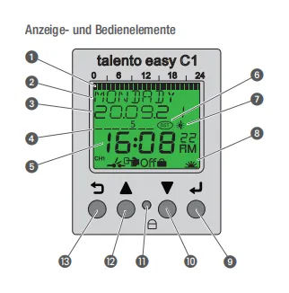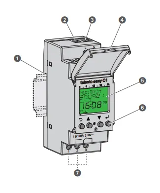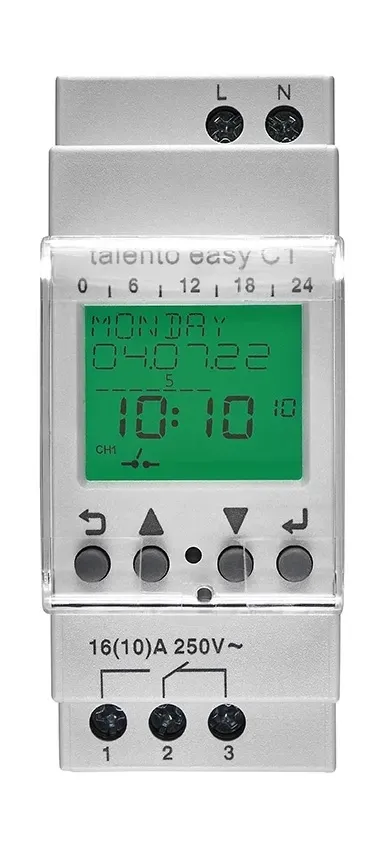 Настройка 12/24 ч. Отображение состояния переключения. Встроенный счетчик часов с режимом обслуживания. Ручной переключатель: автоматический, фиксированный ВКЛ/ВЫКЛ, переопределение. Зеленая подсветка дисплея облегчает чтение. Энергонезависимая память (EEPROM) для хранения программ вслучае отключения электроэнергии. Запас хода от аккумулятора до шести лет. Часы могут быть запечатаны и защищены с помощью PIN-кода для предотвращения несанкционированного доступа. Программирование выполняется непосредственно на часах.