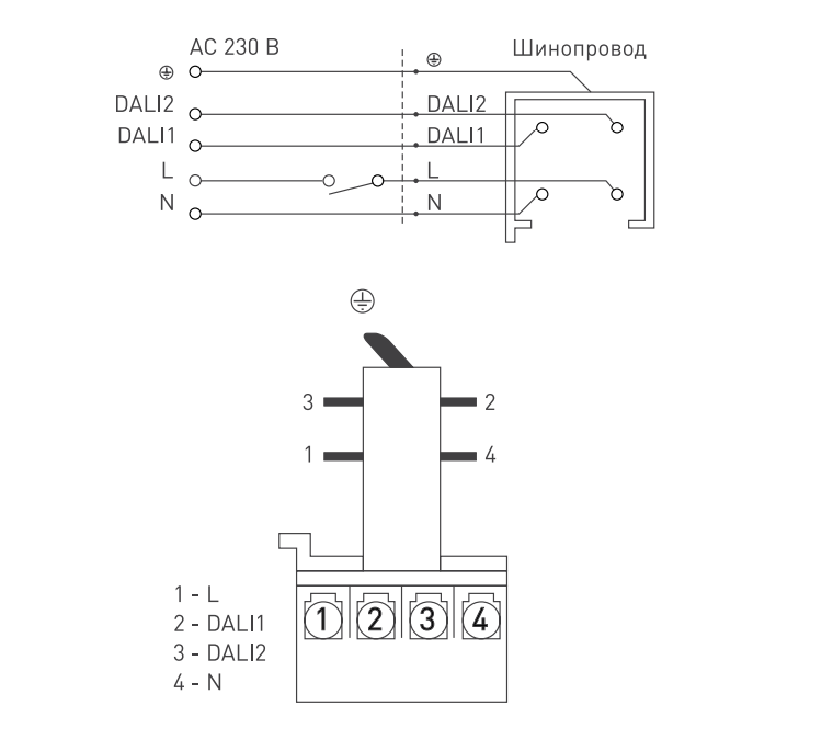 Иногда шины 4TR-системы используются нестандартно, например, для управления по протоколу DALI. В этом случае две шины задействуются для передачи сигнала DALI (шина DALI), а две, как и прежде, для подачи напряжения питания на светильники (L, N). Трек 2TR для этого не подходит, так как у него всего 2 шины.