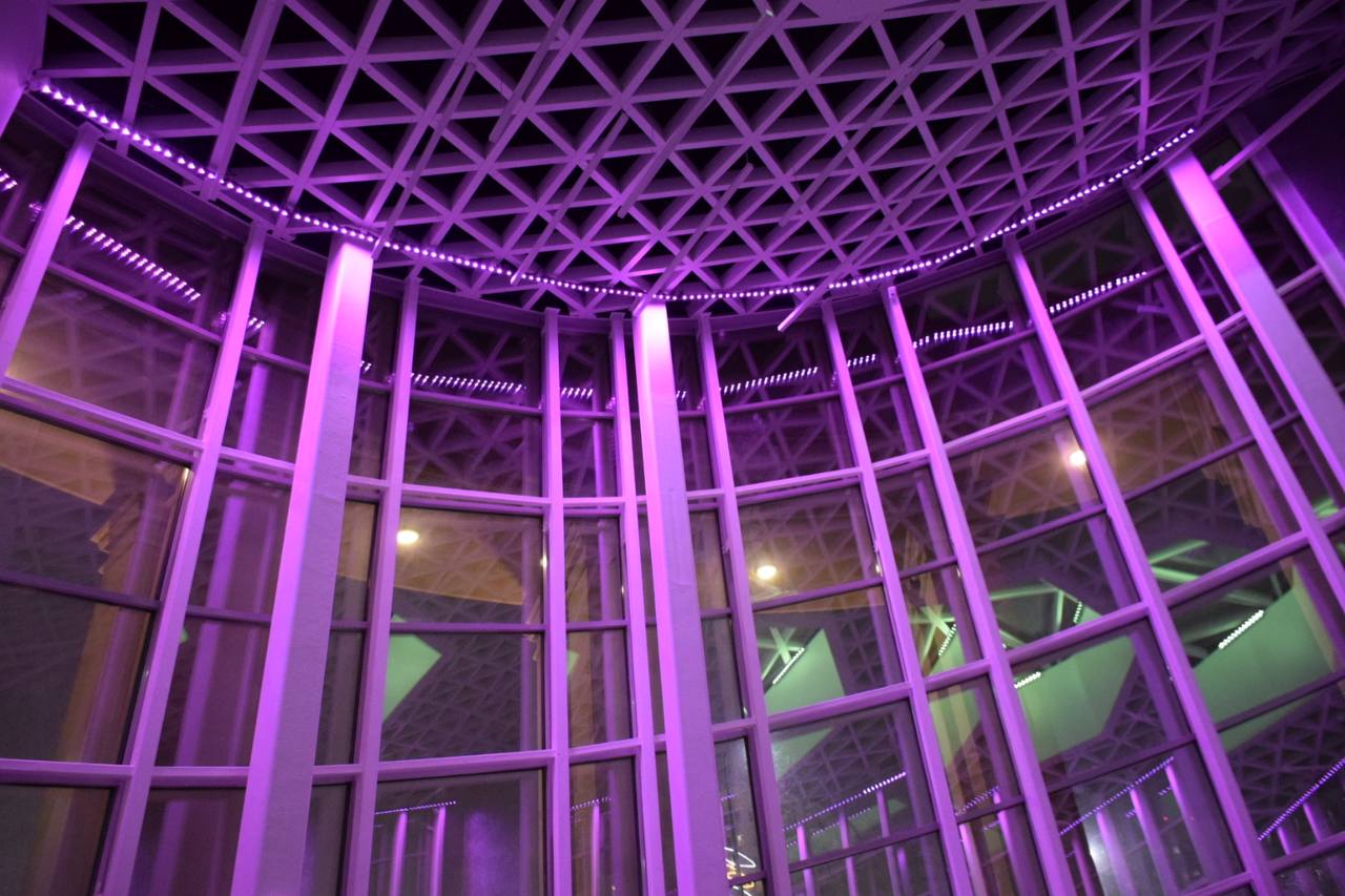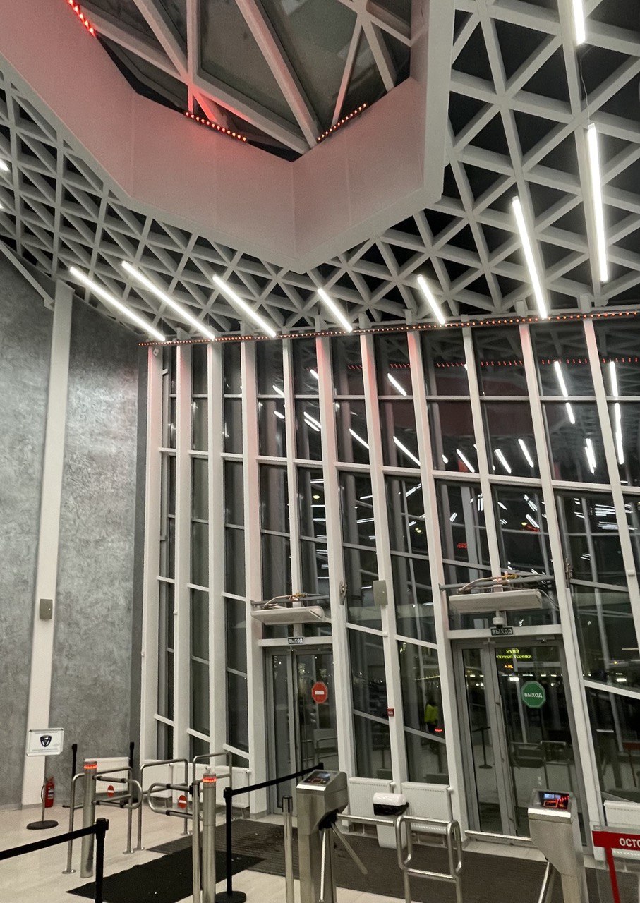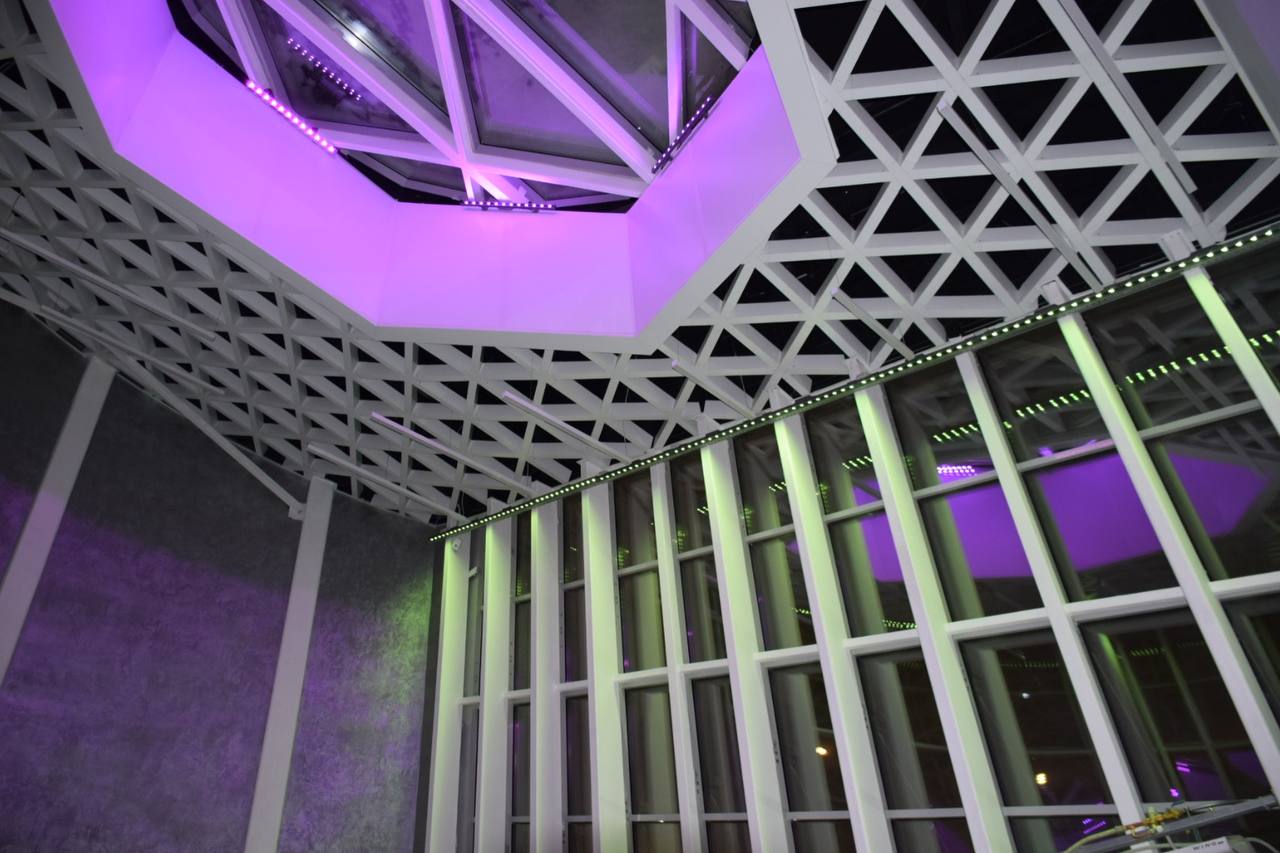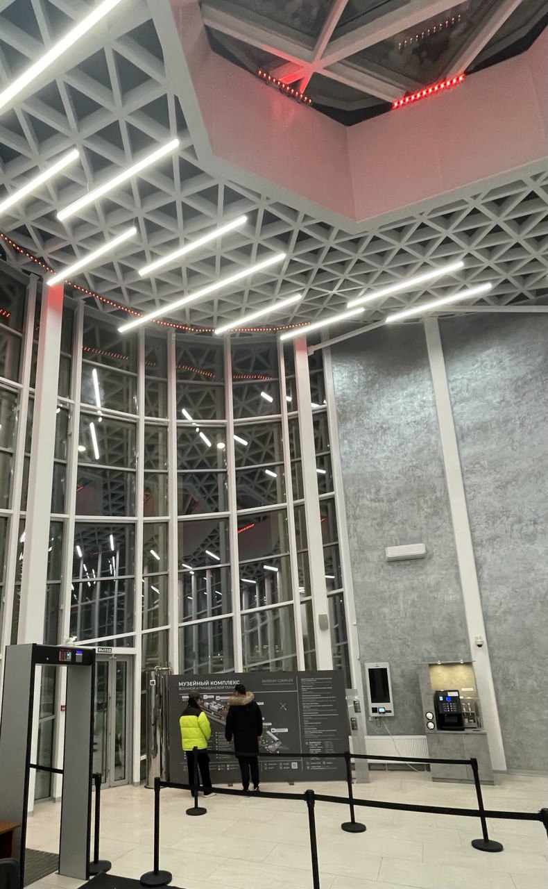 Важную роль в оформлении комплекса играют световые элементы. Светодиодные RGBW-прожекторы были установлены внутри стеклянных конструкций входного павильона музейного комплекса. За счет этого в темное время суток создается динамический эффект заливки помещения светом.