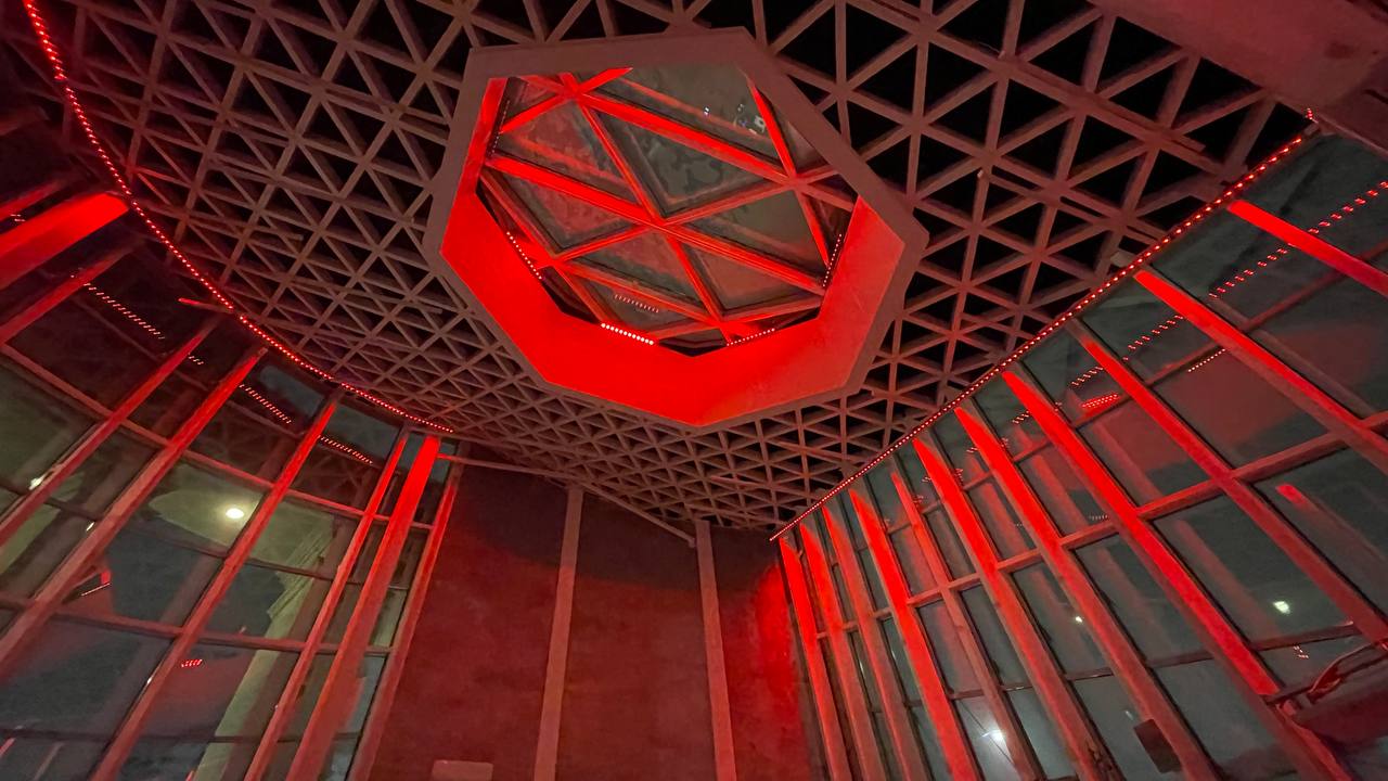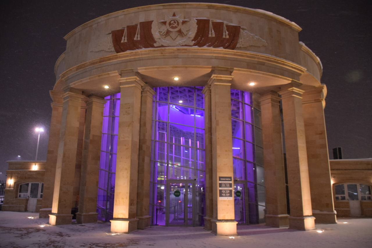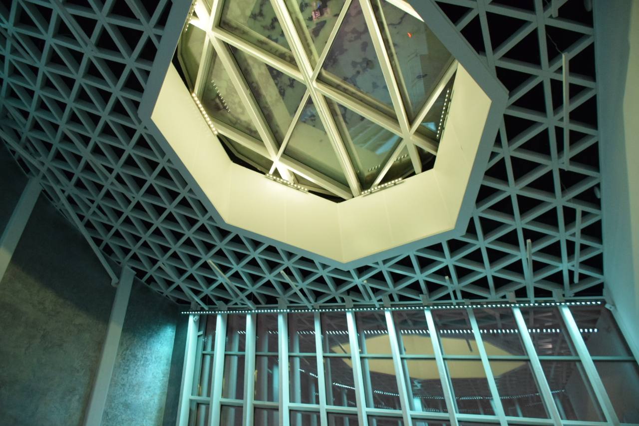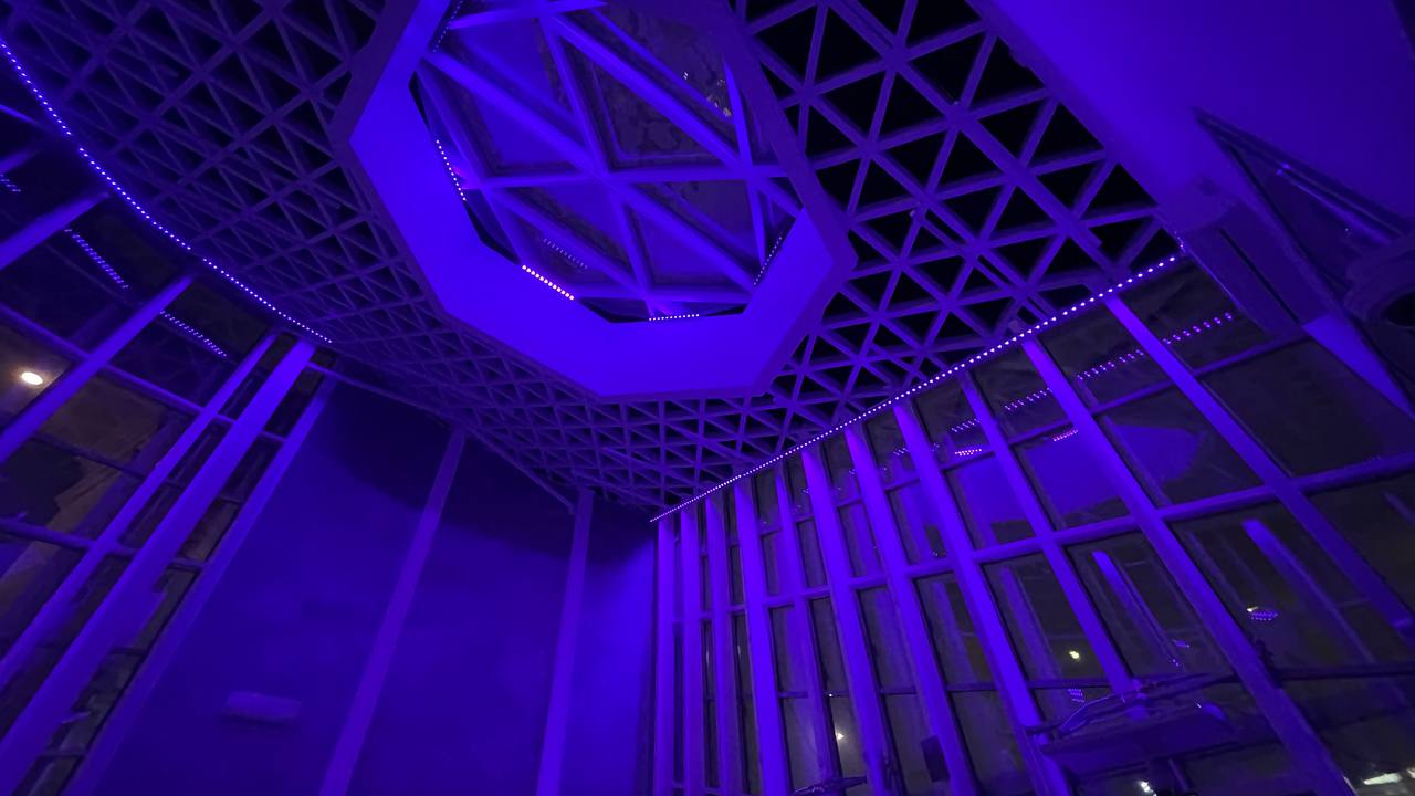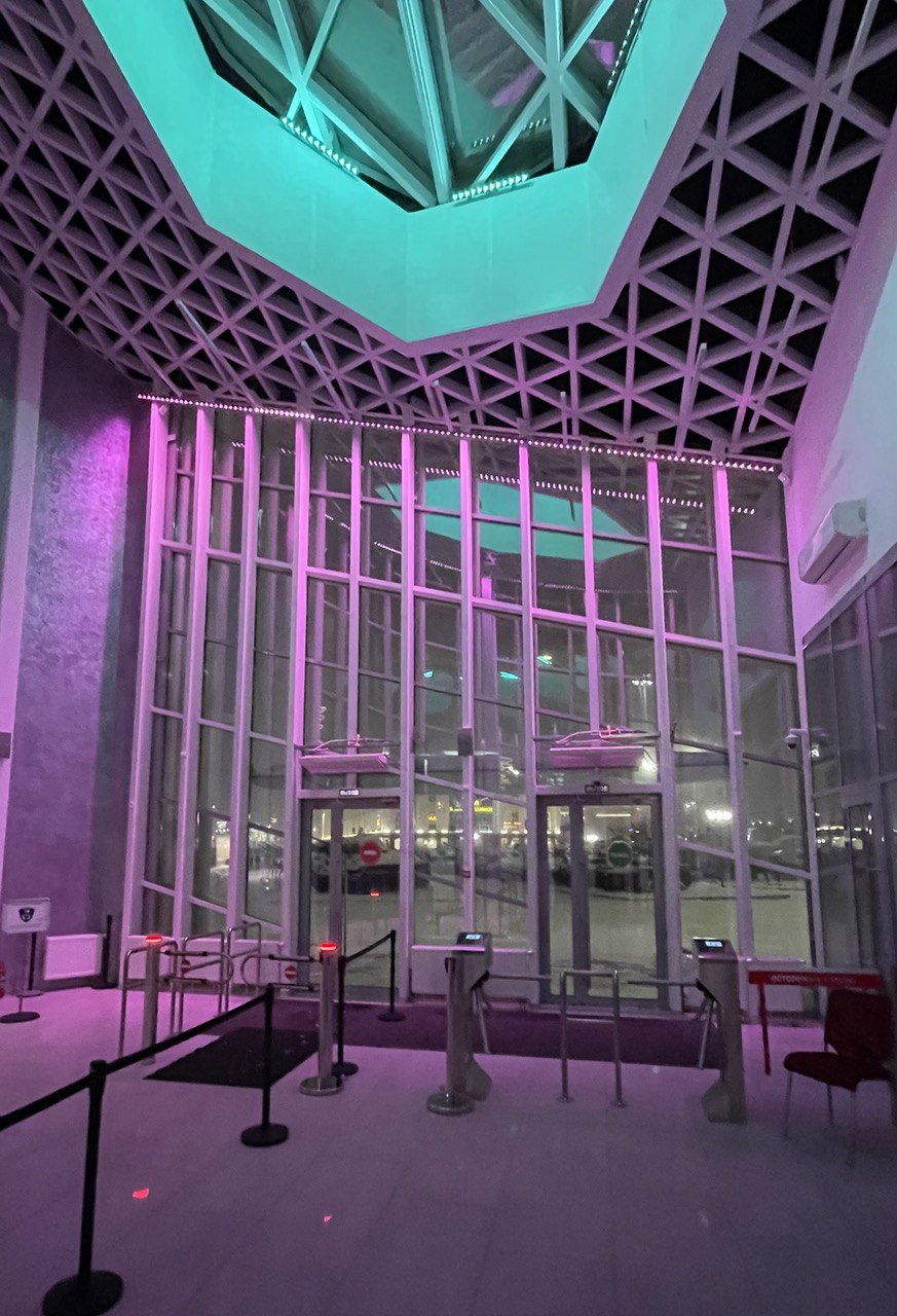 Важную роль в оформлении комплекса играют световые элементы. Светодиодные RGBW-прожекторы были установлены внутри стеклянных конструкций входного павильона музейного комплекса. За счет этого в темное время суток создается динамический эффект заливки помещения светом.